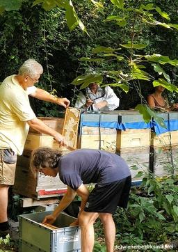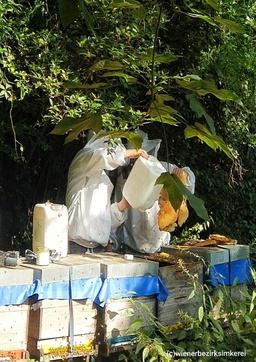 Bild: Honigernte bei den Josefstädter Bezirksbienen im Palais Auersperg. Rechts Fütterung mit bio. Zuckersirup.