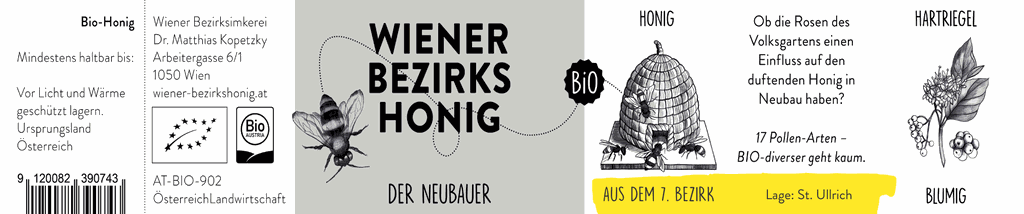 Bezeichnung der Honige nach Bezirken und dann noch genauer, nach den “Grätzln” wo unsere Bezirksbienen leben und sammeln - beides ersichtlich auf unseren Honigetiketten.