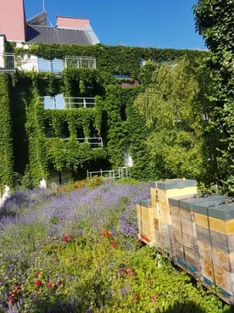 Die Fünfhauser Bezirksbienen am Lavendeldach des Boutiquehotel Stadthalle und das Pollenbild des Fünfhauser Bezirkshonigs.
