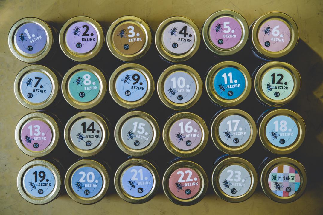 Alle Wiener Bezirkshonige. So wie jeder Honig eine andere Farbe und Charakter hat, so spiegelt sich das auch in unserem Etiketten-Design
